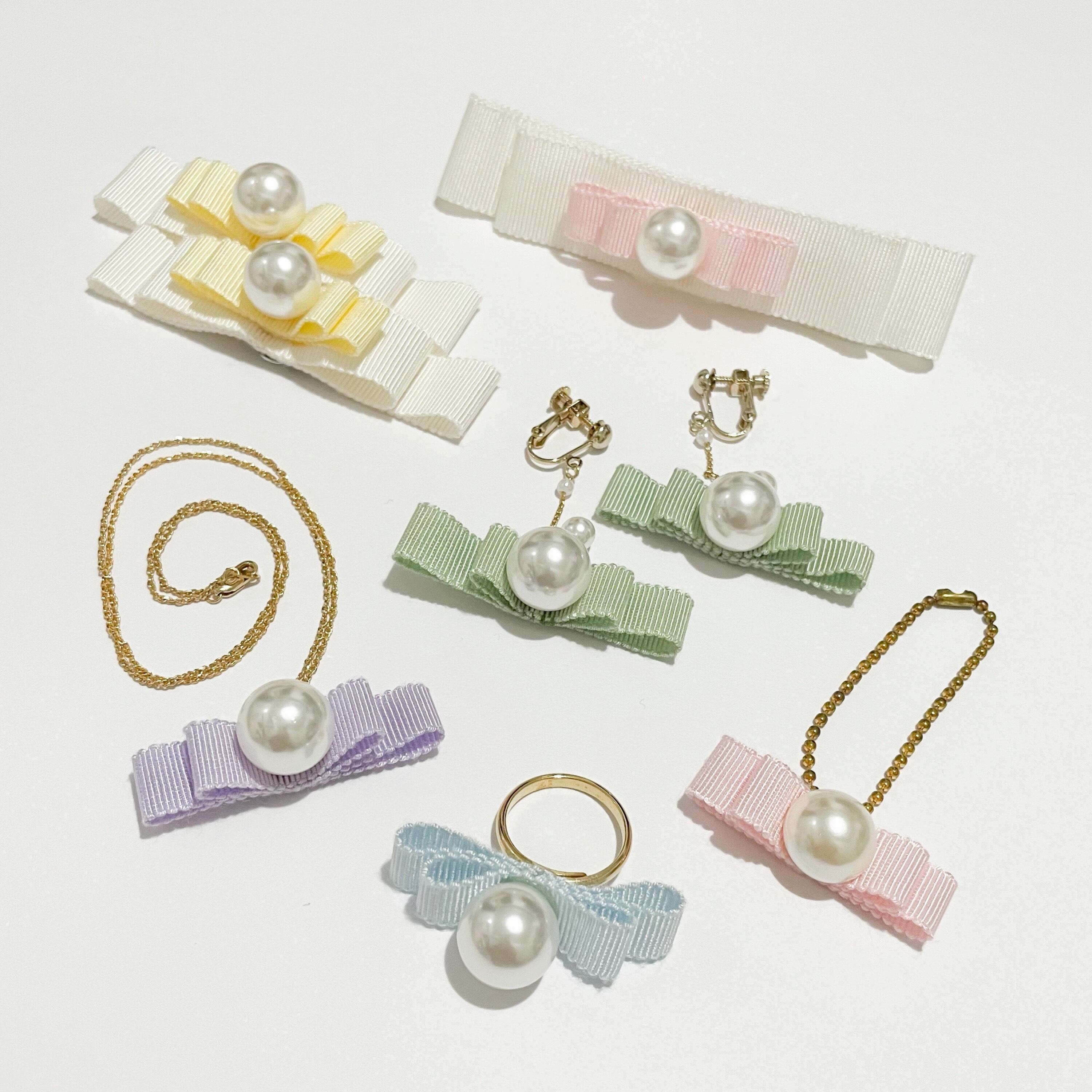 樹脂パールの輝きや存在感と、リボンの優しい色合いが特徴です。