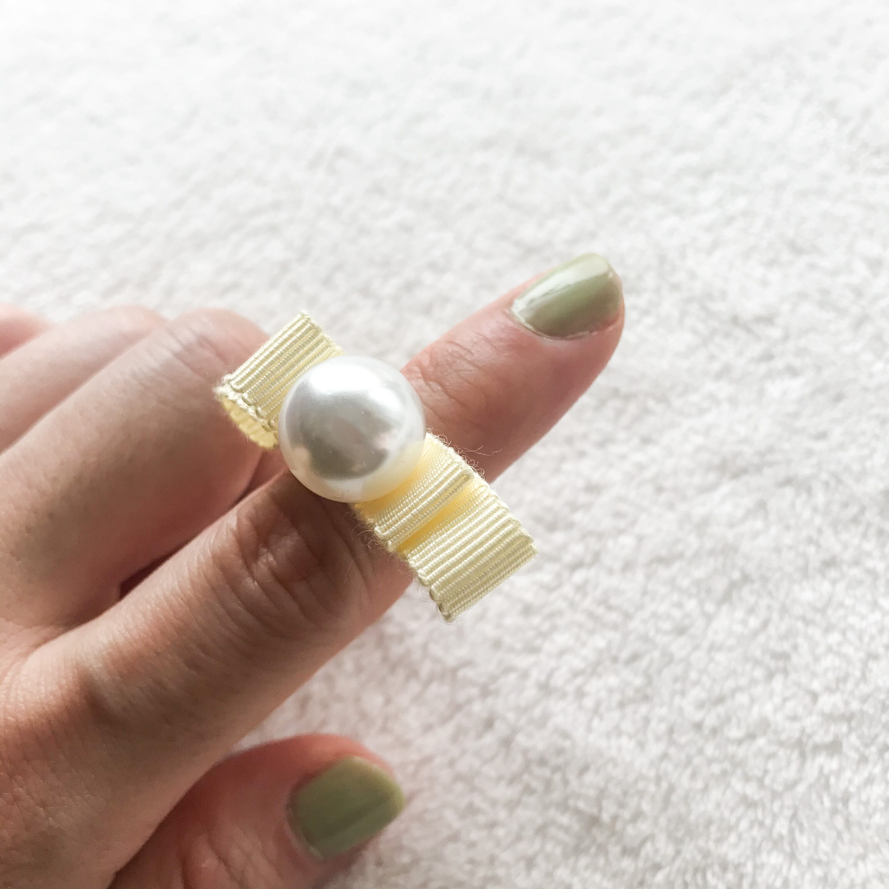 ぽってりとした樹脂パールと、はながさいたようなリボンが象徴的。
