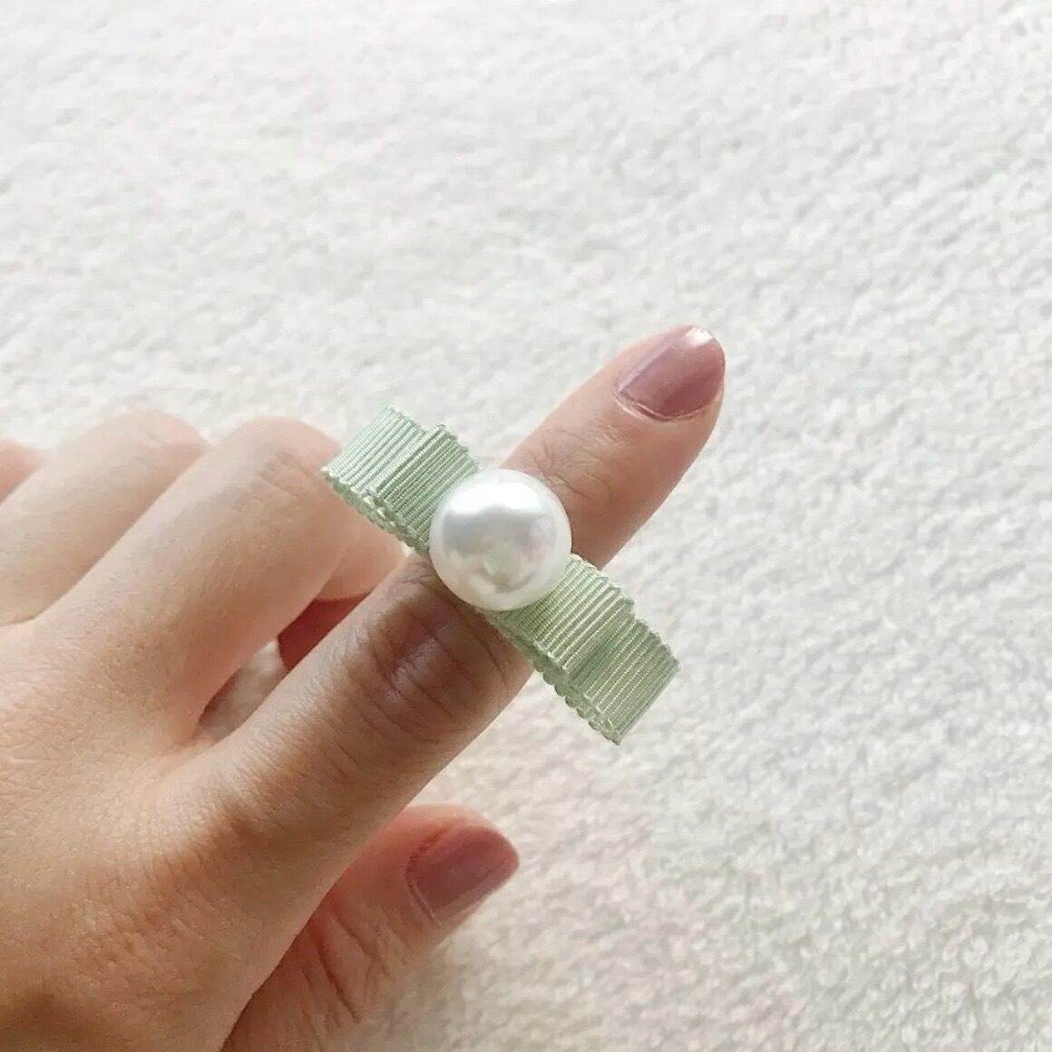樹脂パールの輝きや存在感と、リボンの優しい色合いが特徴です。