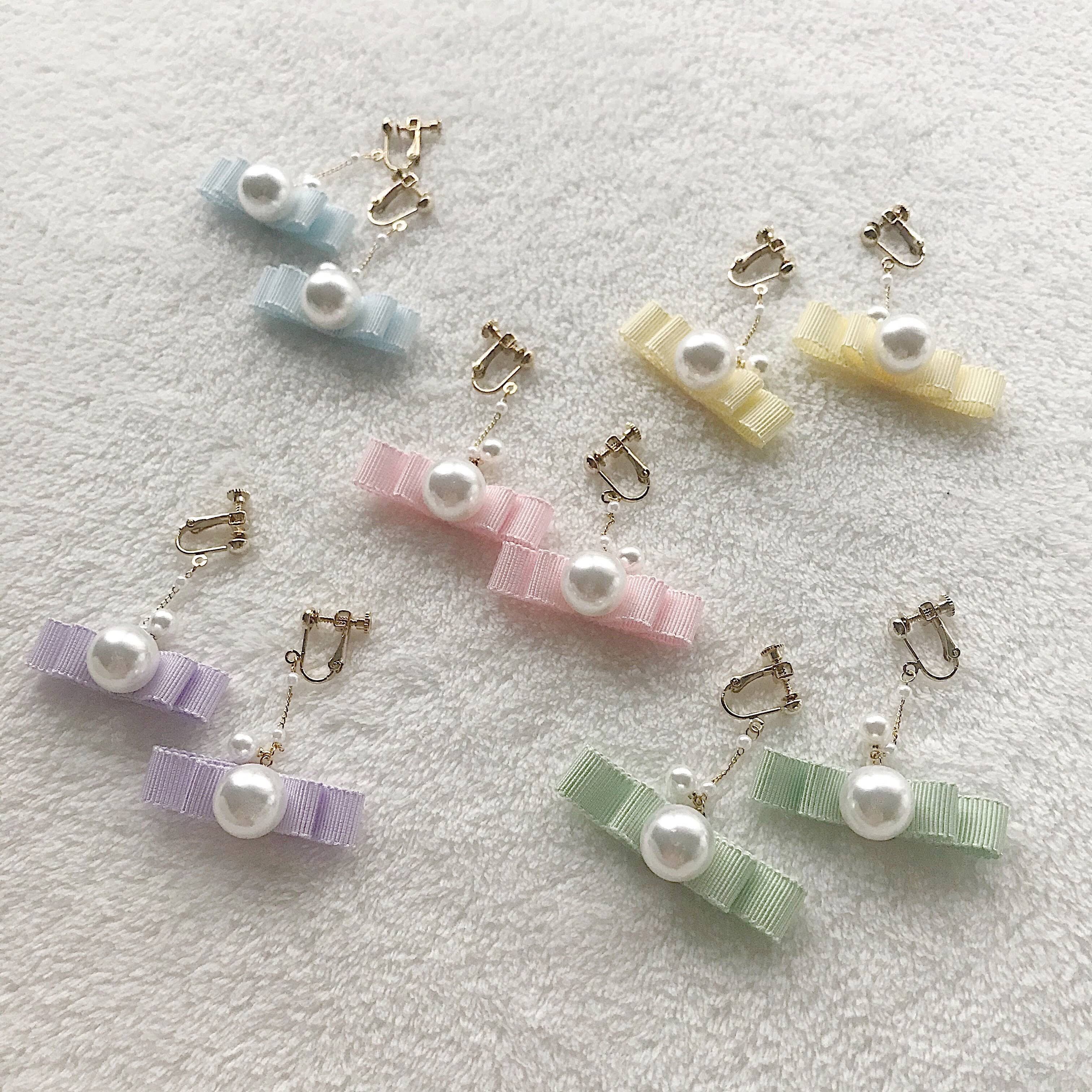 樹脂パールの輝きや存在感と、リボンの優しい色合いが特徴です。