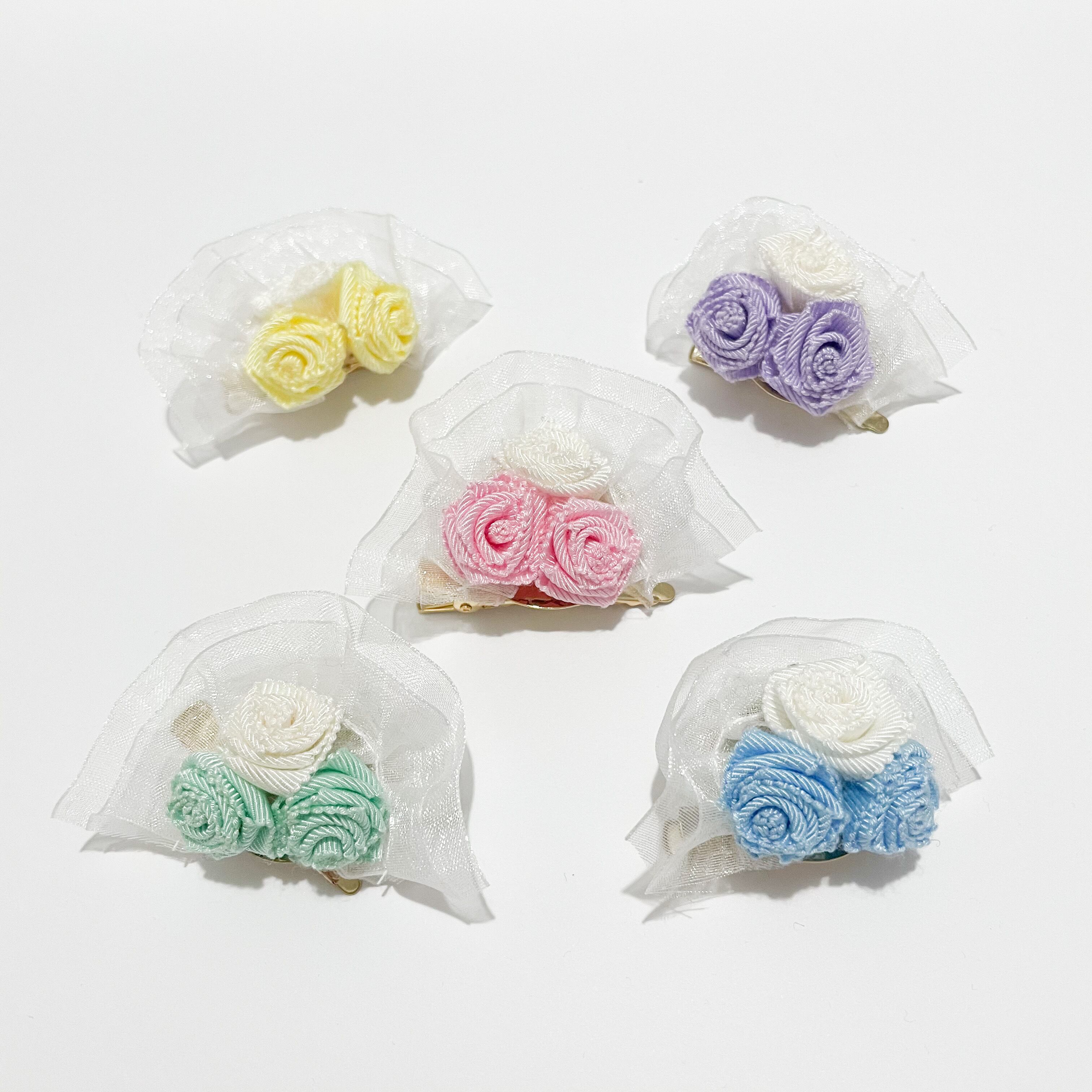 パステルカラーのローズを主役に、クリアカラーのオーガンジーフリルを添えました。