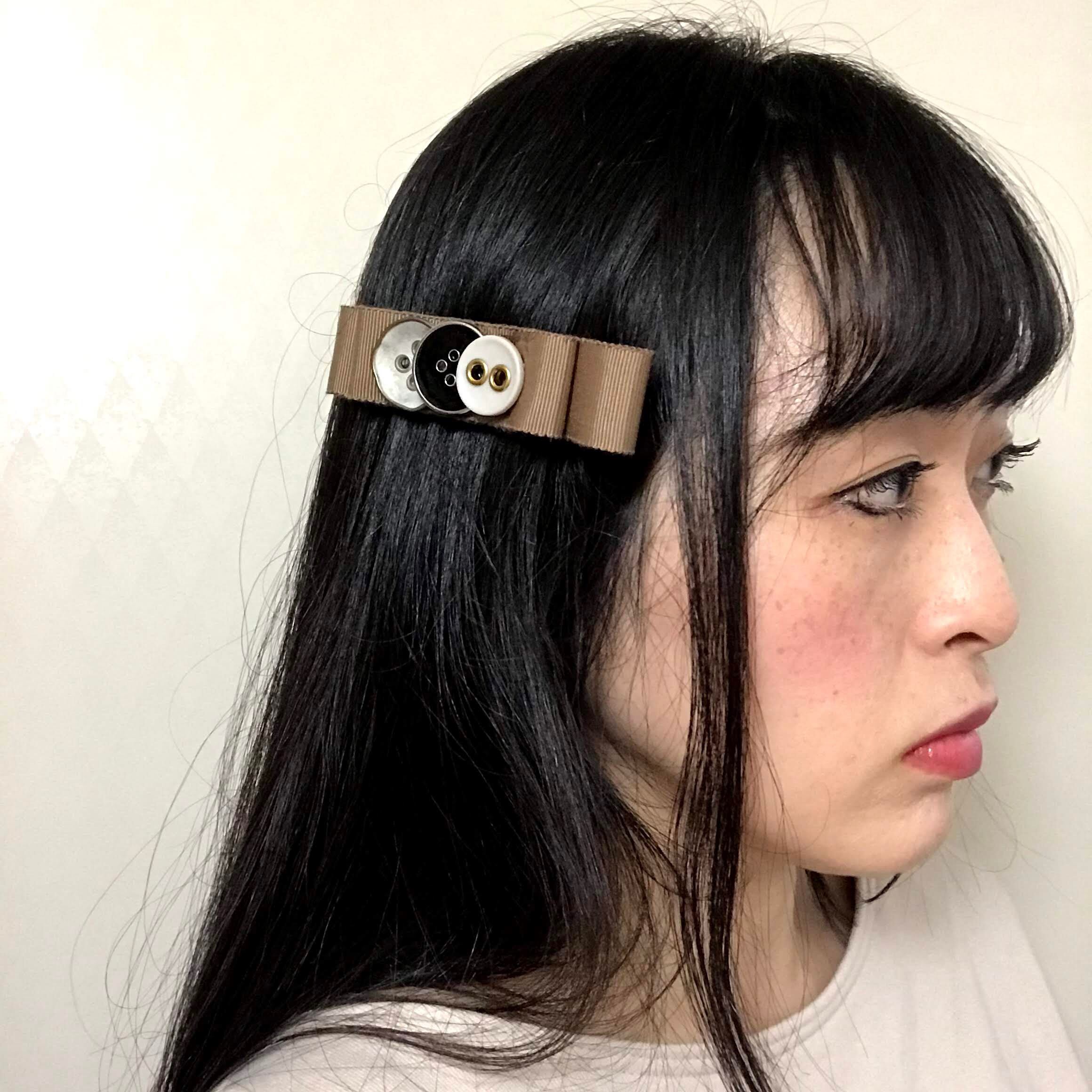 大きめなリボンモチーフに、仲良く並ぶアンティークボタンが際立っています。