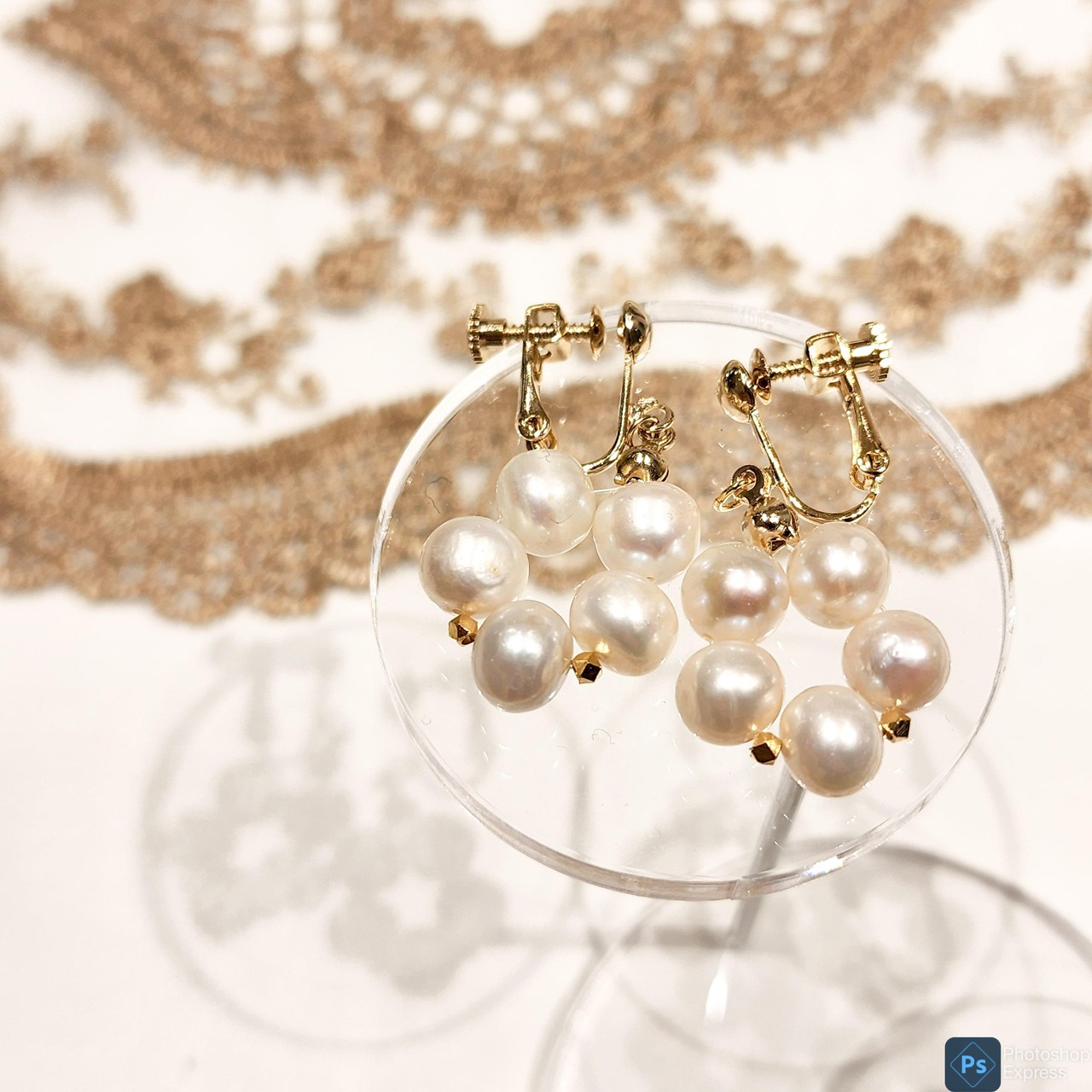 淡水パールと少しのgoldパーツで、セレモニー関係の場にもつけられるものを作りました。